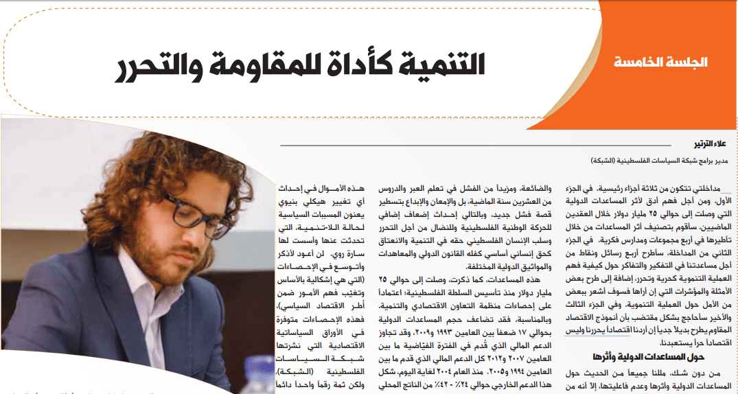 في ظل العيش تحت شرط كولونيالي استعماري، فالتنمية لا تعني إلاّ الاشتباك، وبالأخص الاشتباك من أجل الأرض لزرعها وفلاحتها واسترجاعها كمدخل أول للتنمية وعمليتها المستدامة…التنمية هي بالطبع عملية طويلة الأمد، وكأية عملية تتطلب قيادة تمثيلية وتتطلب شرعية لهذه القيادة. فالتنمية هي عملية سياسية بامتياز، وليست عملية تكنوقراطية أو تقنية كما يفهمها الفاعلون في “صناعة التنمية” منذ أوسلو.