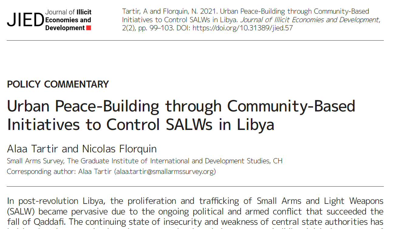 Tartir, A. and Florquin, N., 2021. Urban Peace-Building through Community-Based Initiatives to Control SALWs in Libya. Journal of Illicit Economies and Development, 2(2), pp.99–103. DOI: http://doi.org/10.31389/jied.57